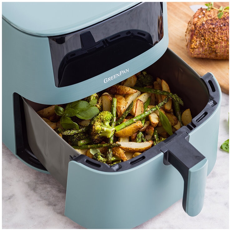 This XXL Air Fryer is a versatile companion for your kitchen. With its PFAS-free ceramic non-stick coating, you can now savour crispy and healthy food with just a fraction of the oil or fat. Experience effortless healthy cooking with the 13 convenient one-touch presets: air-fry, bake, roast and grill in a flash. The generous 7.2 litre basket is spacious and perfect for serving 4-6 people. Comes with a crisping tray to ensure more even heat distribution and airflow around larger food items. Cleaning up afterward is a breeze too.